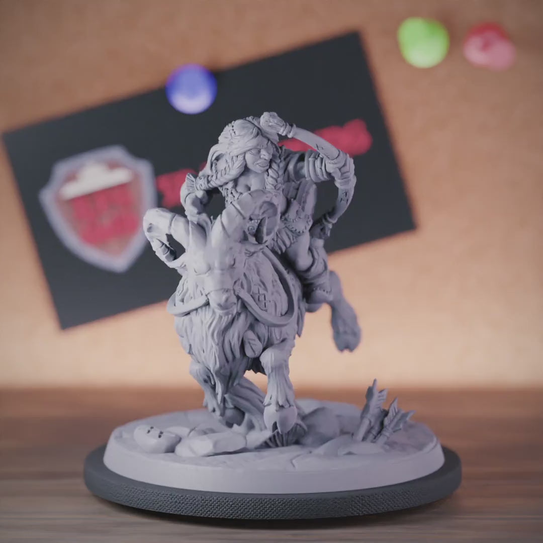This stunning miniature captures the ferocious Dwarf in mid-battle, galloping across the battlefield on her powerful Ram mount and raining down arrows on her unsuspecting foes. Introduce this bold Dwarf warrior to your next D&D adventure, whether as a playable character or a formidable NPC ally. Her fierce determination and deadly accuracy with a bow will make her an invaluable asset in any party.