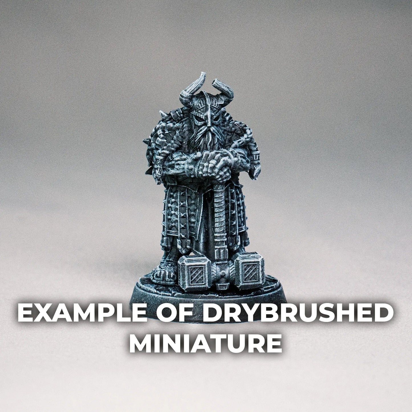 After gluing and applying a black primer to the miniature, we perform a light drybrush technique to enhance shadows and details. This gives the miniature a more defined appearance.